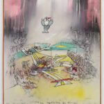 Matta presented this large canvas as a gift to longtime friend Max Ernst in 1971 in celebration of Ernst’s eightieth birthday. The work depicts a playful and carnal celebration. Presiding over this erotic fête and bathed in a central shaft of light is Ernst’s alter-ego and bird familiar, Loplop, humorously holding what may well be a birthday cake with candles burning. The painting is dated on Max’s birthday, April 2nd.