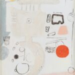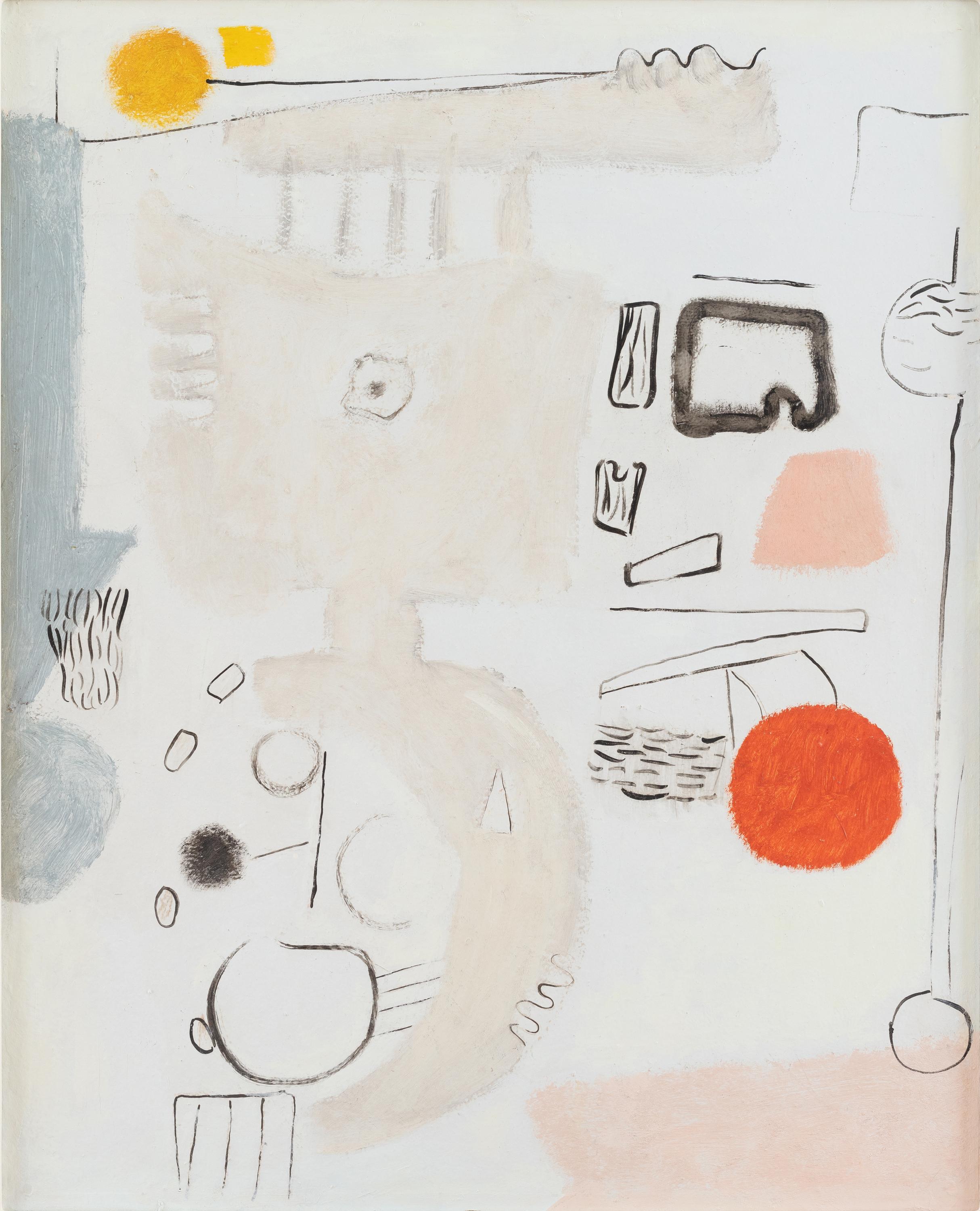 Öl, weiße Kreise und Graphit auf Pergamin